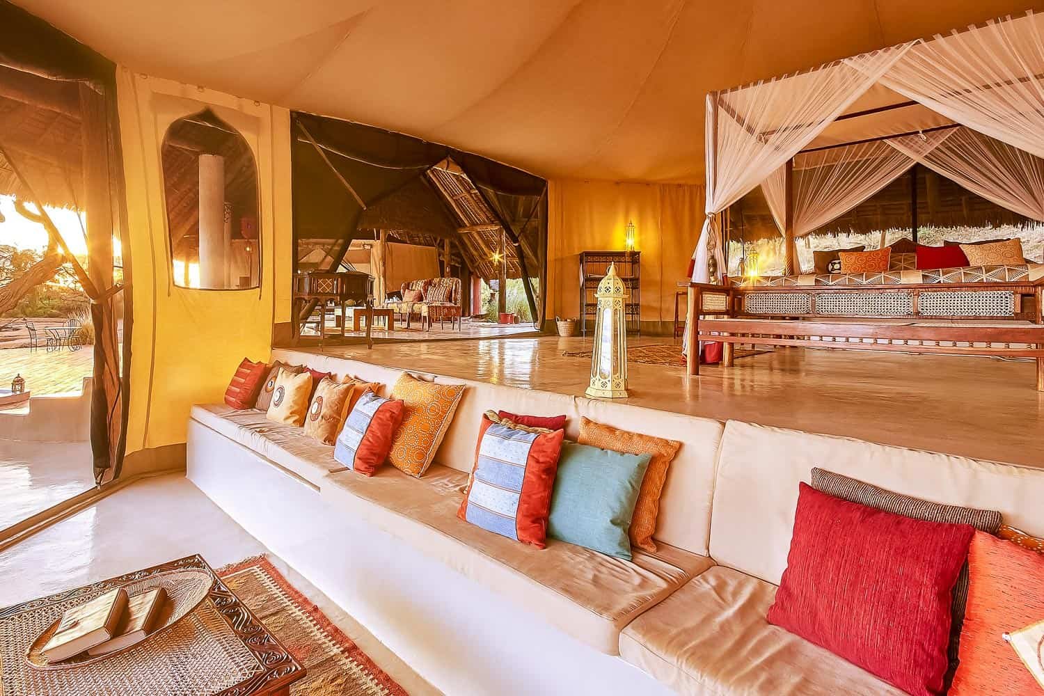 Sasaab is a luxury safari lodge perched above the Ewaso Nyiro River in the wild and remote landscapes of Samburu, northern Kenya. Blending Moroccan and Swahili design with open-air elegance, the lodge offers just nine spacious tented suites (including a family unit), each over 100 m² with private plunge pools, expansive verandas, and breathtaking views across the river and plains toward Mount Kenya.